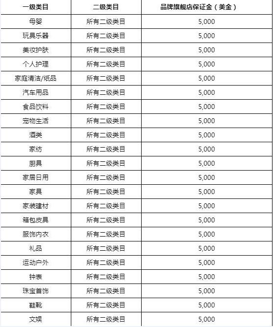 1) 品牌旗舰店:申请的品牌为已注册成功(R)的商标,基准保证金为50,000人民币;所申请的品牌为暂未注册成功(TM)的商标,则保证金为100,000人民币;