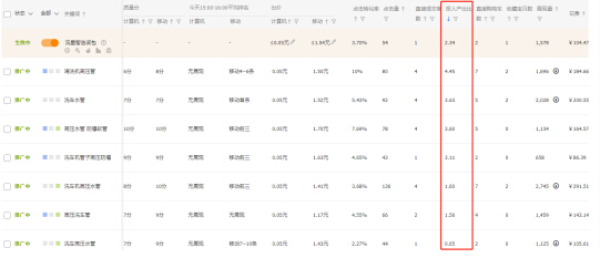 我们看这几个推广关键词,投产比,高于2的,赚钱,那我们给它加价,低于2的,有点亏我们给它降价。