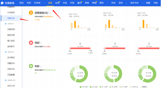 这里能显示全店的数据,我们根据这里就可以分析出这个店铺的精准人群年龄段、消费层级、地域等等信息。