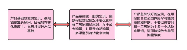 针对推广的特点,相对较适合一些低客单标品,需要冲量来突出产品,且标签化人群不明显。通过对销量的增加,提升排名,推广引流,再带动转化。所以在针对各种推广方式的选择上,大家要分析好自身的需求和现状,不要看别人如何做,你的店铺不取决于别人,好好考虑这点,这也是一部分人的通病。
