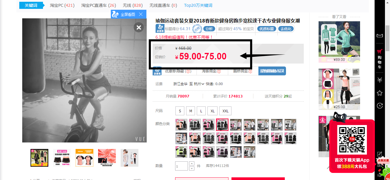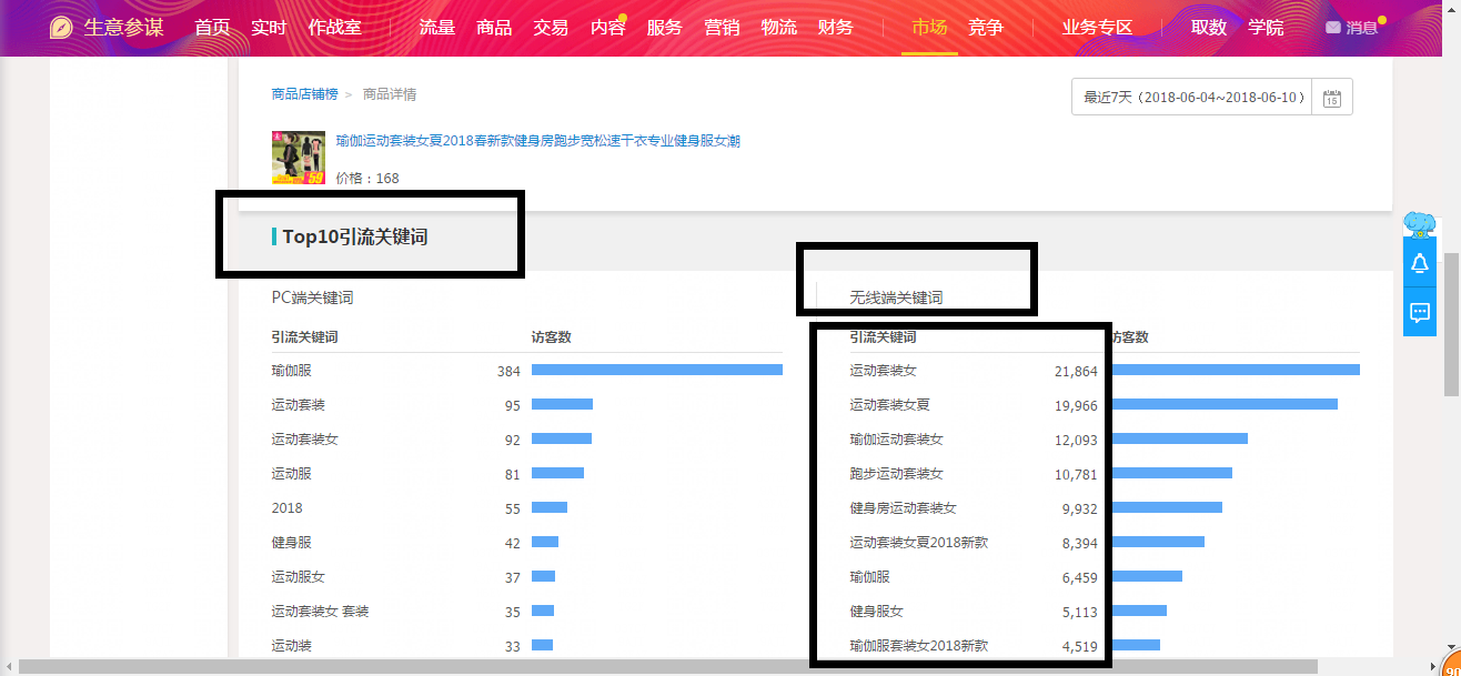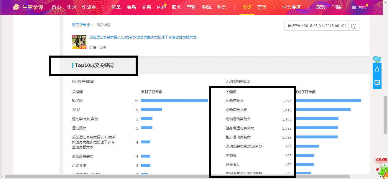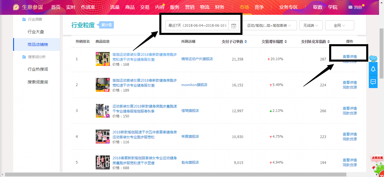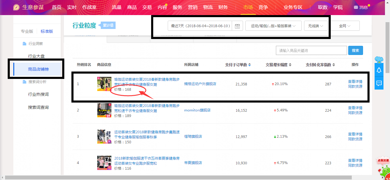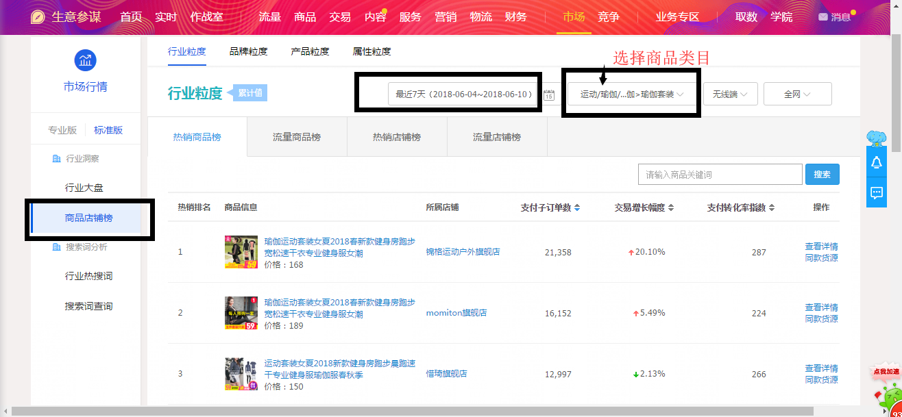 这家店铺的主推款是“瑜伽 套装”那么市场行情里面的类目选择“瑜伽 套装”就可以了!