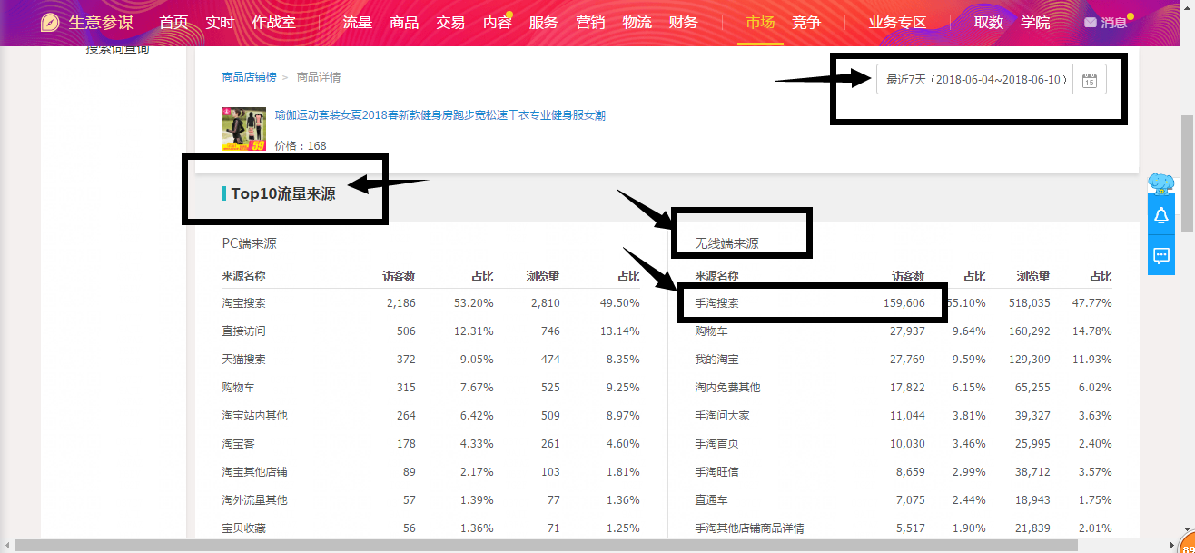 这个时候我们来看“Top10流量来源”那么这里就是这个宝贝最近7天的流量渠道的数据!这个时候我们就要去筛选那些(无线端来源)搜索流量占比高的,如果说这个宝贝的直通车、淘宝客流量来源占比是最高的,那么这个宝贝我们就没必要考虑!这是第一步,确定款式、风格、价格!