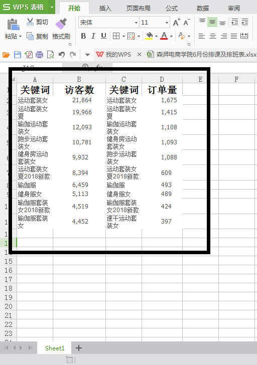 那么会用公式的同学就用表格公式进行计算,不会公式的同学就直接用计算器来算,也是一样的!在这里老师只是算出了这几个宝贝的转化率,那么同学们在操作过程中就要把这些转化率全部计算出来!那么我们通过这些数据的对比就可以发现,”跑步运动套装女”和”健身房运动套装女”这2个词的转化率是最高的,那我们把他标黄!同时把他们的访客数也标黄!