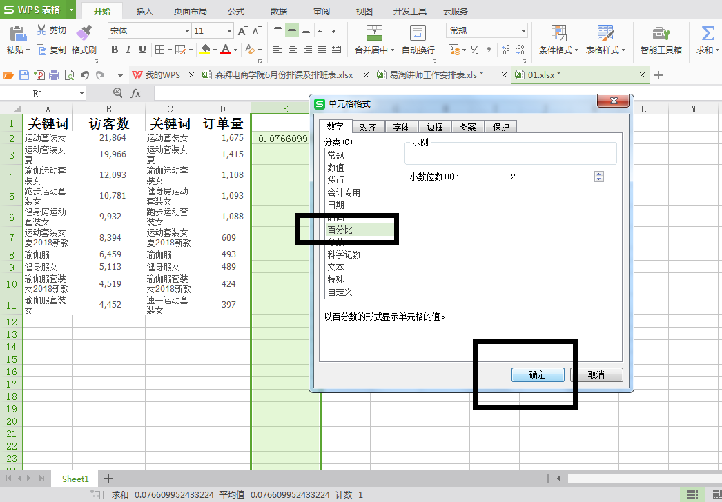 那么这里首先输入“=”然后 鼠标左键点击“订单量”后面的数字 再输入“/”除以 (鼠标左键点击) 咱们上面的“访客数”,然后直接按“回车”,也就是用 订单量/访客量=转化率 对不对!把转化率设置成百分比—— (选择转化率列——鼠标右键——设置单元格格式——百分比——小数位数 2——确定)!