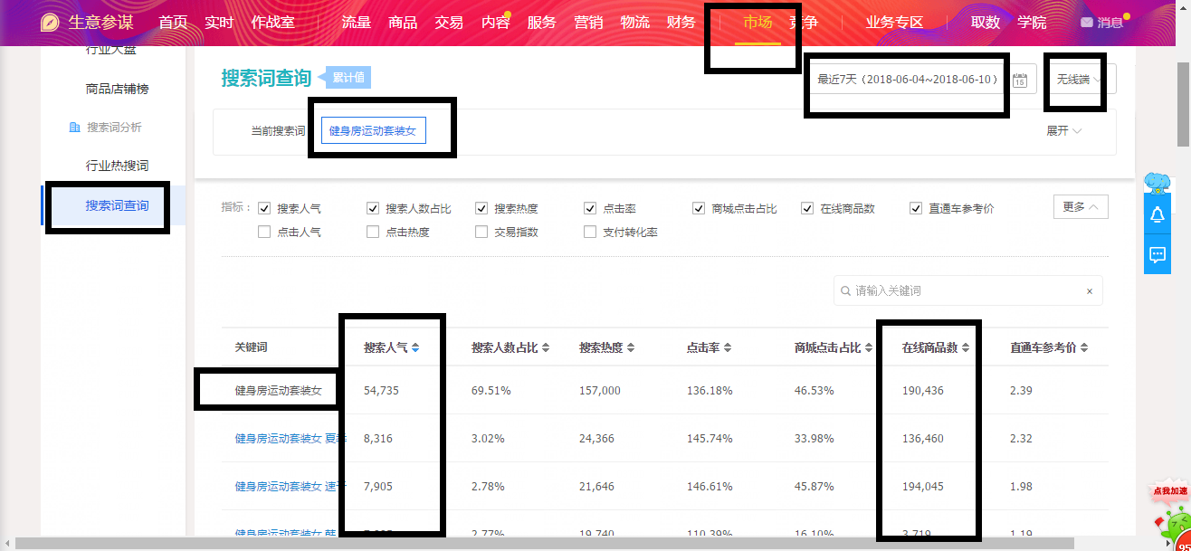 这就是我们的第一点,要去确定好宝贝的:款式、风格以及价格!那比如说我们现在把转化率比较高的“健身房运动套装女”词作为我们的目标词,那么这个时候我们需要去搜索一下这个词(市场——搜索词查询——输入关键词——相关词查询)看下这个词最近7天的“搜索人气”以及“在线商品数”看下搜索人气以及在线商品数的数值做出评估!