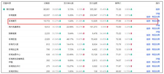 尤其是搜索进店流量和直通车进店流量,这种不精准会直接导致转化率下滑,并且伴随的还有页面停留时间短、跳失率高等表现。并且这种不精准,主要是进店关键词不精准,你可以在生意参谋——商品——商品分析——单品分析中进行分析,看最近30天的无线端数据,在手淘搜索那一项,点击“详情”,可以看一下进店关键词的表现